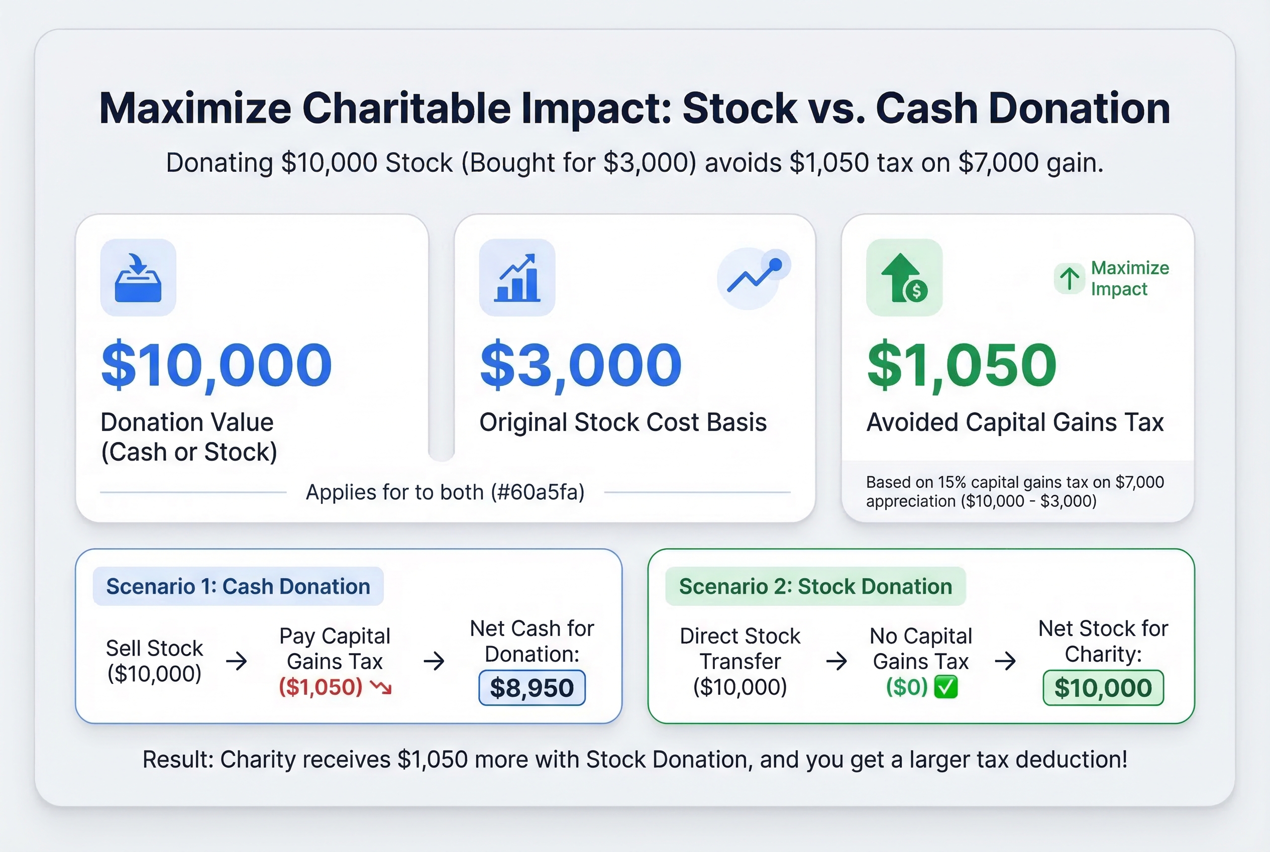 Think of it like this: why give the IRS a cut of your charitable donation? When you donate stock directly, you skip the tax bill entirely. The charity gets $1,050 more, and it doesn't cost you an extra penny.