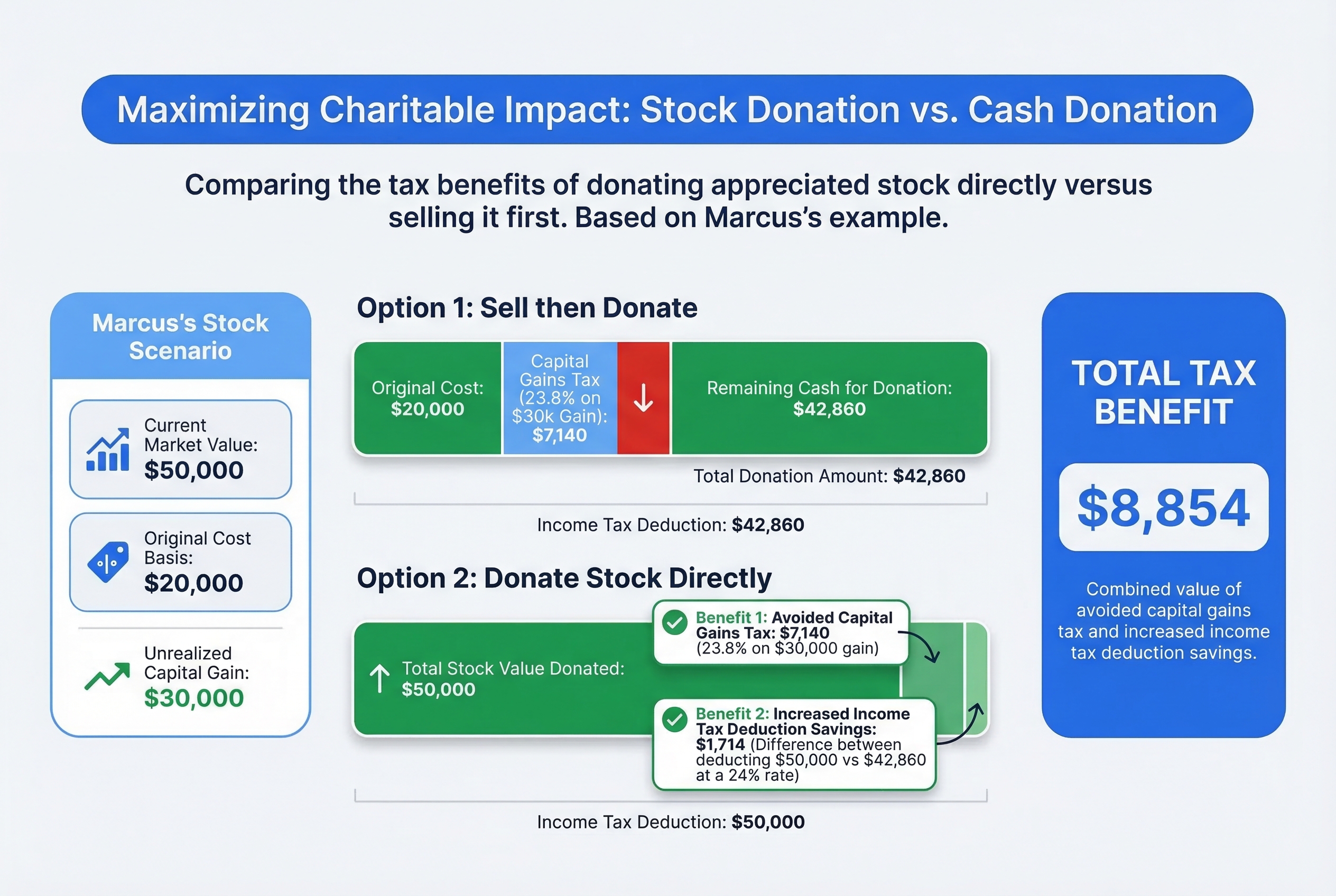 By donating stock instead of cash, Marcus gives $7,140 more to charity. Yes, his out-of-pocket cost is $5,426 higher, but the charity receives dramatically more.