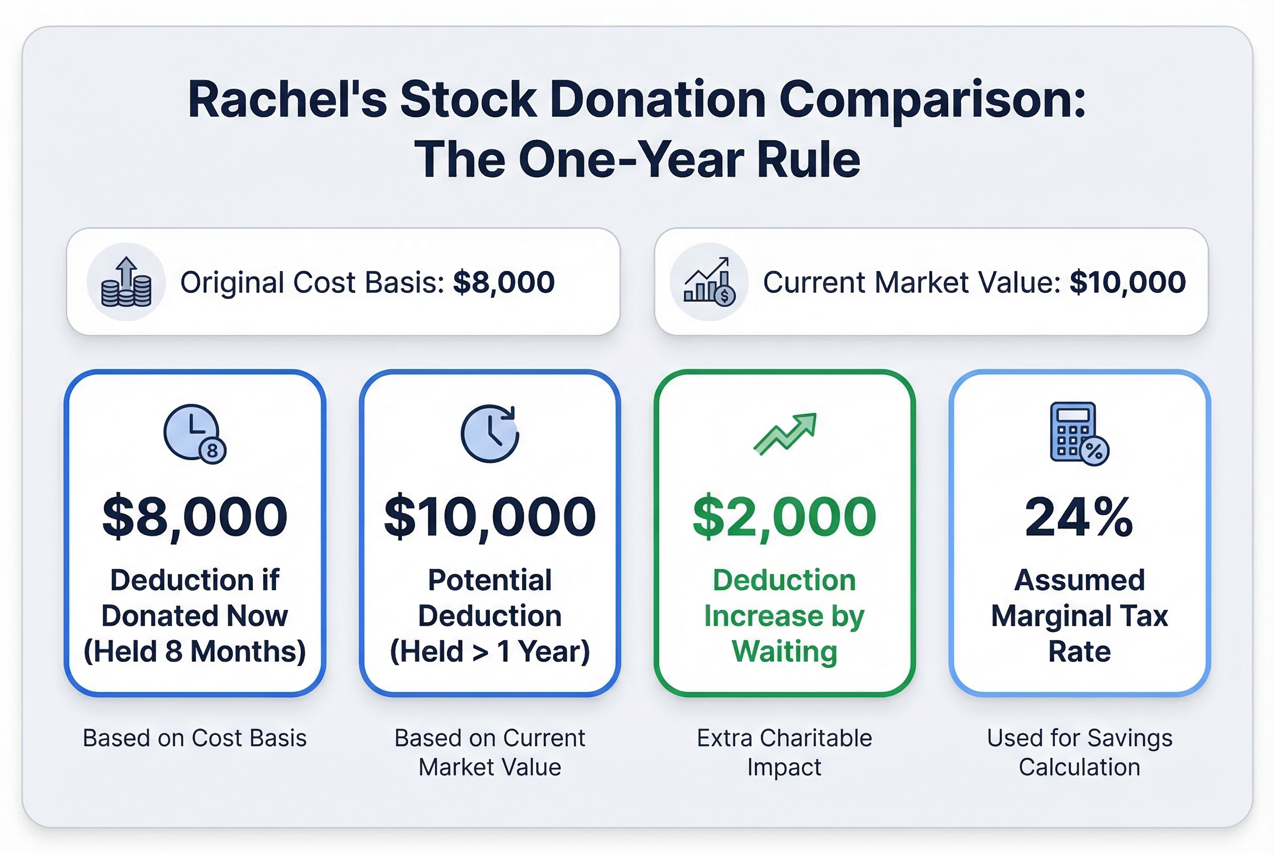 To get these benefits, you must hold the stock for more than one year before donating. We'll cover this requirement in detail later, but it's worth noting now.