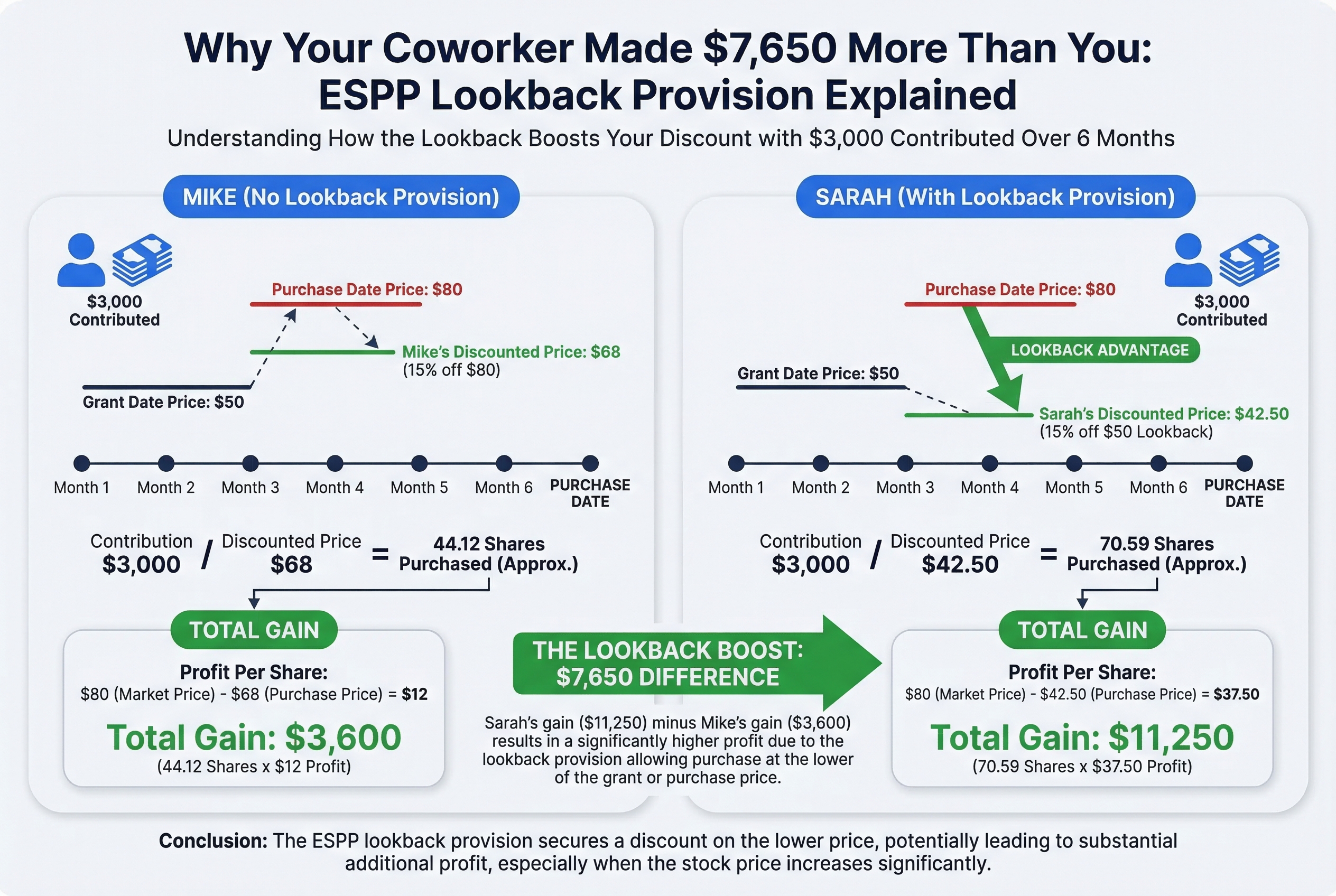 The difference? You save an extra $25.50 per share. If you bought 100 shares, that's $2,550 in extra savings just from the lookback provision.
