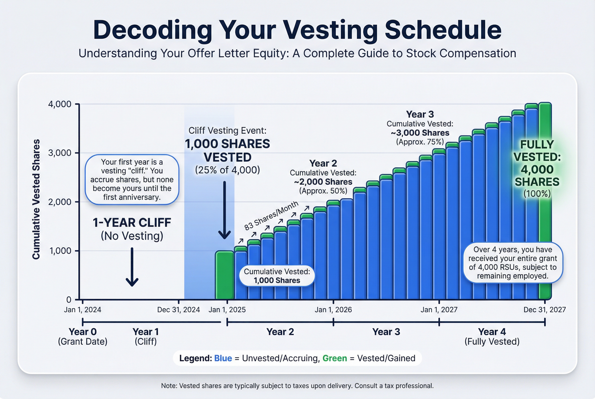 When your offer letter says "4,000 RSUs with a 4-year vesting schedule," that means you'll receive those 4,000 shares gradually over four years. You don't own them all on your first day. You earn them by staying at the company.